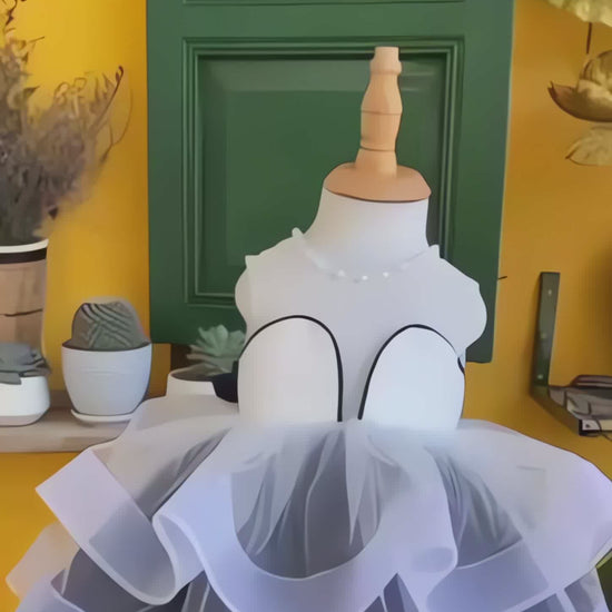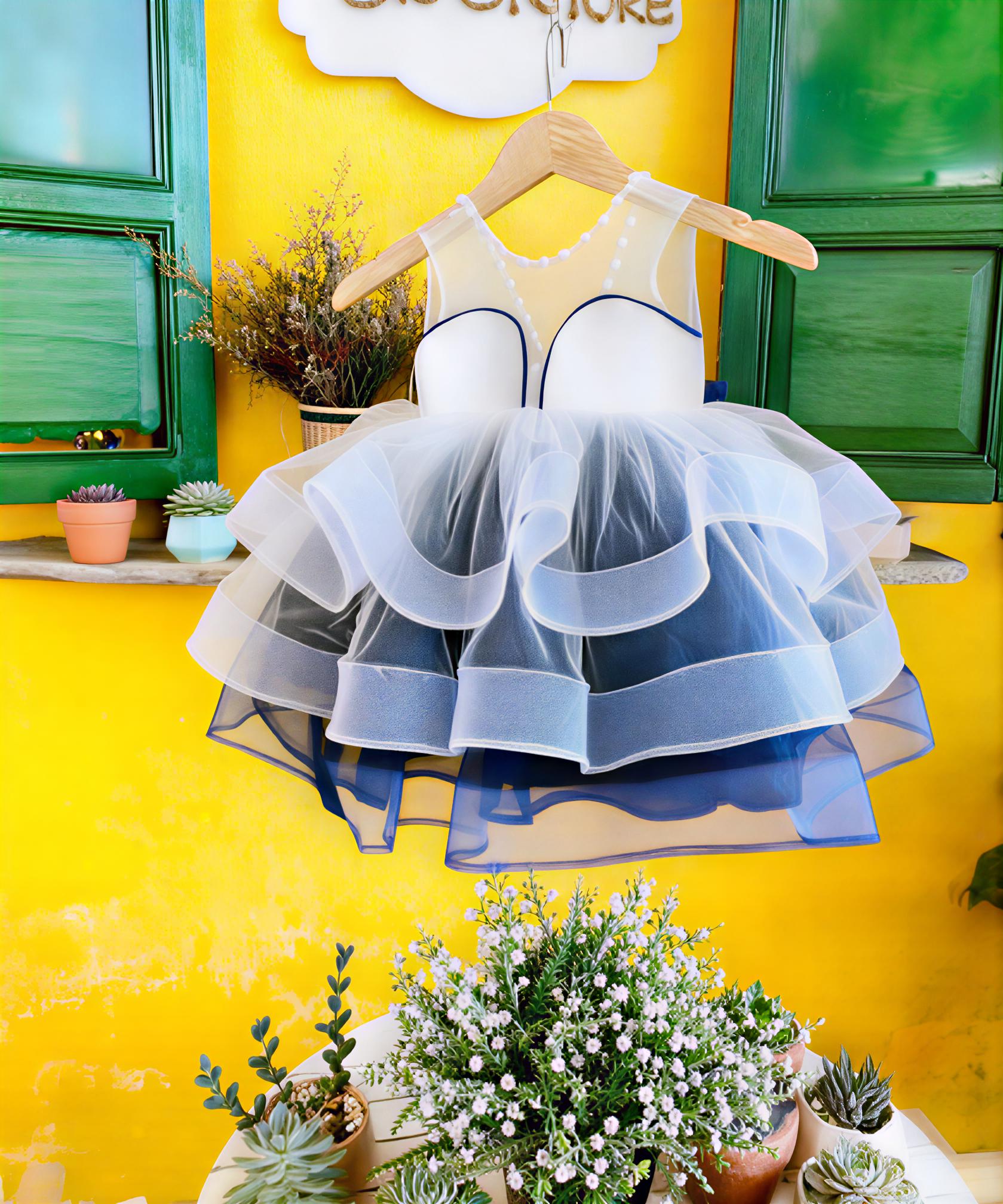 This boutique-style dress features a soft ivory bodice with delicate pearl embellishments and subtle navy piping, paired with a white and blue fishing-line tulle skirt that holds its shape beautifully for a voluminous, cloud-like silhouette. The gentle shimmer and layered design bring a touch of elegance to every twirl - perfect for birthdays, weddings, and cherished celebrations.