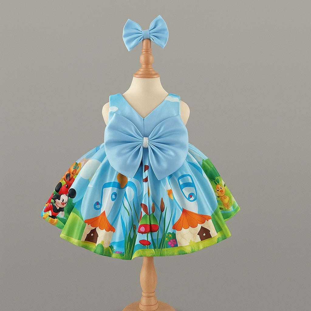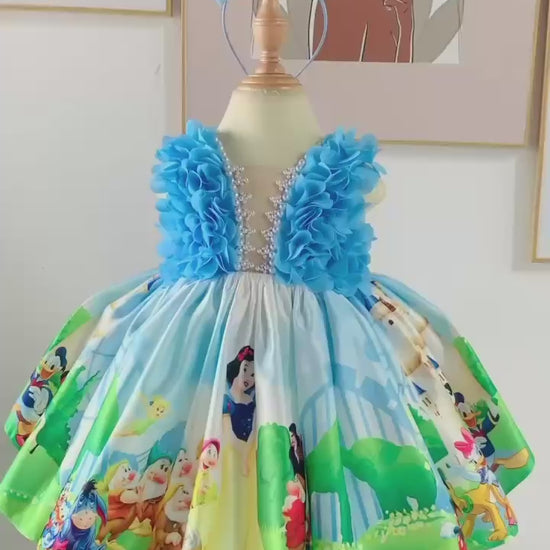 Step into a world of wonder with the Snow Princess Charm dress - a vibrant, fairy-tale inspired piece featuring colourful garden scenes, Snow white and the seven Dwarfs, and a dreamy full skirt. This enchanting dress is perfect for birthday wishes, magical moments, and twirls that sparkle. Made with soft floral ruffles, a pearl detailed bodice, and an adorable bow, it's a must-have for any fairy-tale fan.